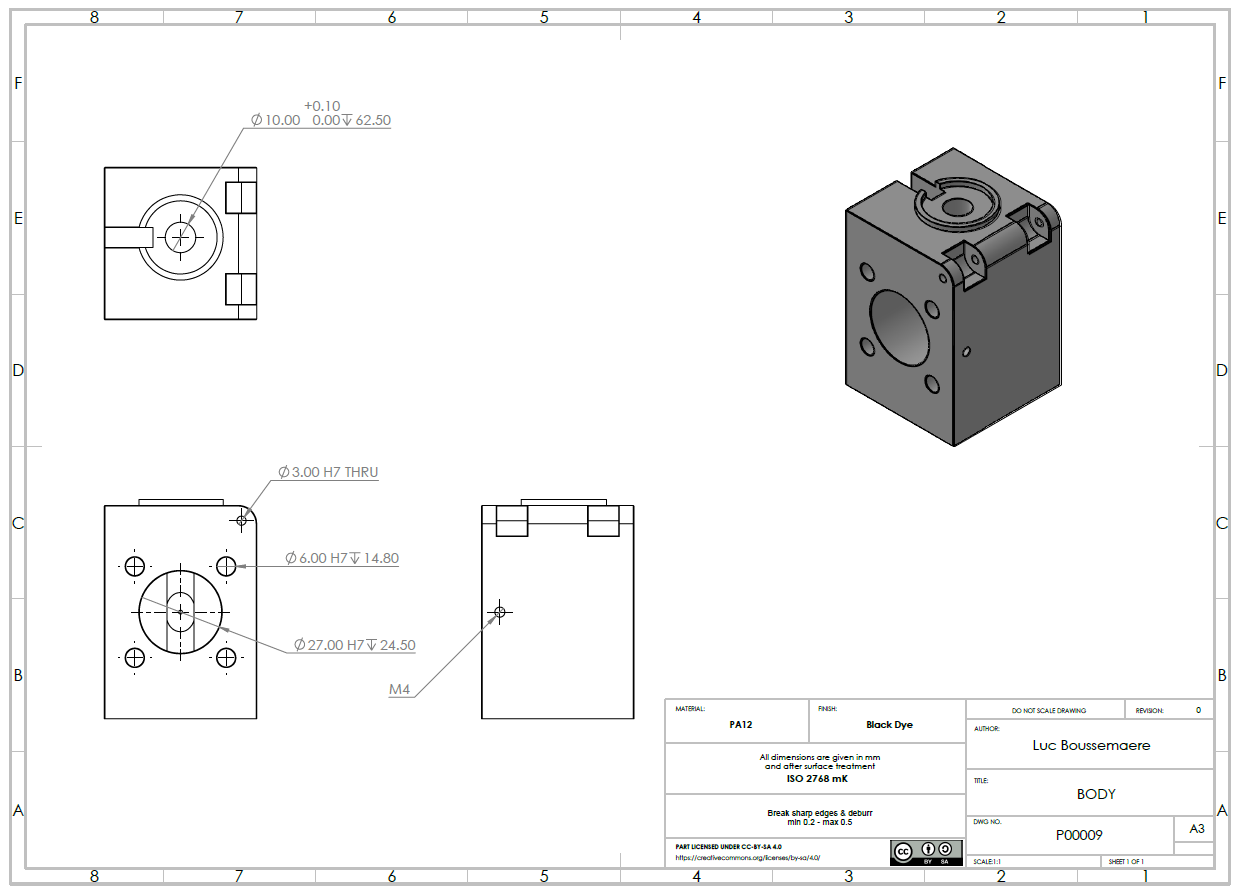 • Multiple holes on the front face need H7 tolerance. This is usually performed using precision reamers which are available in standardized sizes (⌀3 mm, ⌀6 mm etc.). Larger holes, like the one of ⌀27 mm need to be machined using a CNC milling machine. In all cases, you can consult the assembly PDF to check which parts interract with the feature. Here, the ⌀27 mm hole should accept an optical barrel with minimal gap between the two parts - the CNC milling job can then be adjusted in consequence.