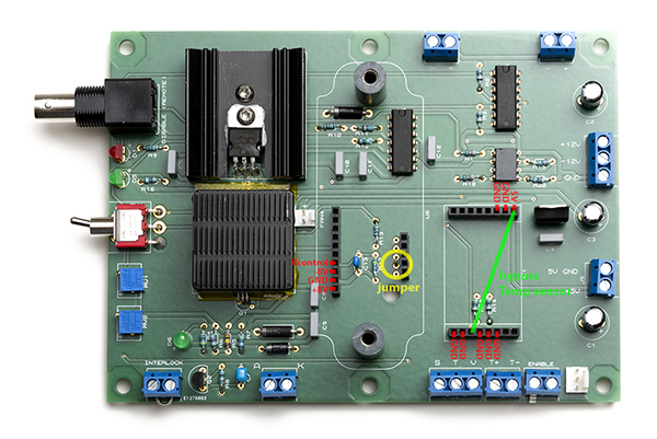 15. Add a jumper wire to the interlock and connect the key switch to the enable header blocks. Add a jumper wire to bypass the MTD415TE as shown in green in the previous picture.