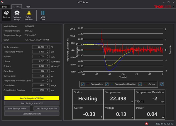 The temperature should stabilize to the set point without oscillation, as shown in the picture. Note that I recommend increasing the Temperature Window to 250 mK (image shows 100 mK). You may also fine tune your PID settings using the procedure described in Thorlabs datasheet but the values given here should already be a good approximation for your setup.