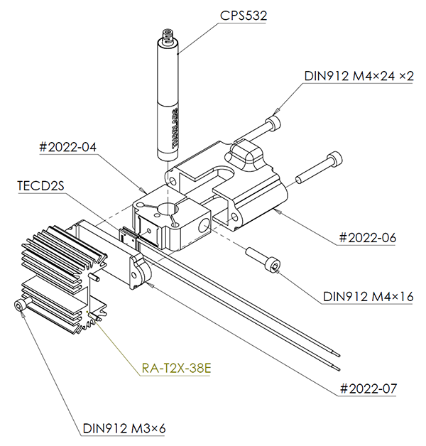 Thermal control of the laser housing is done using Thorlabs TECD2S peltier element but any compatible peltier will do the job as well. The “hot” side of the peltier is cooled by natural convection using a heat sink RA-T2X-38E while the “cold” side is connected to the laser via a custom clamping mechanism that is insulated from natural convection using a 3D part that also keep both the hot and cold side clamped together via plastic screws. I’m putting “hot” and “cold” sides between quotes here because we will mainly use the TEC for heating and not for cooling so the heat sink will actually be the cold part.